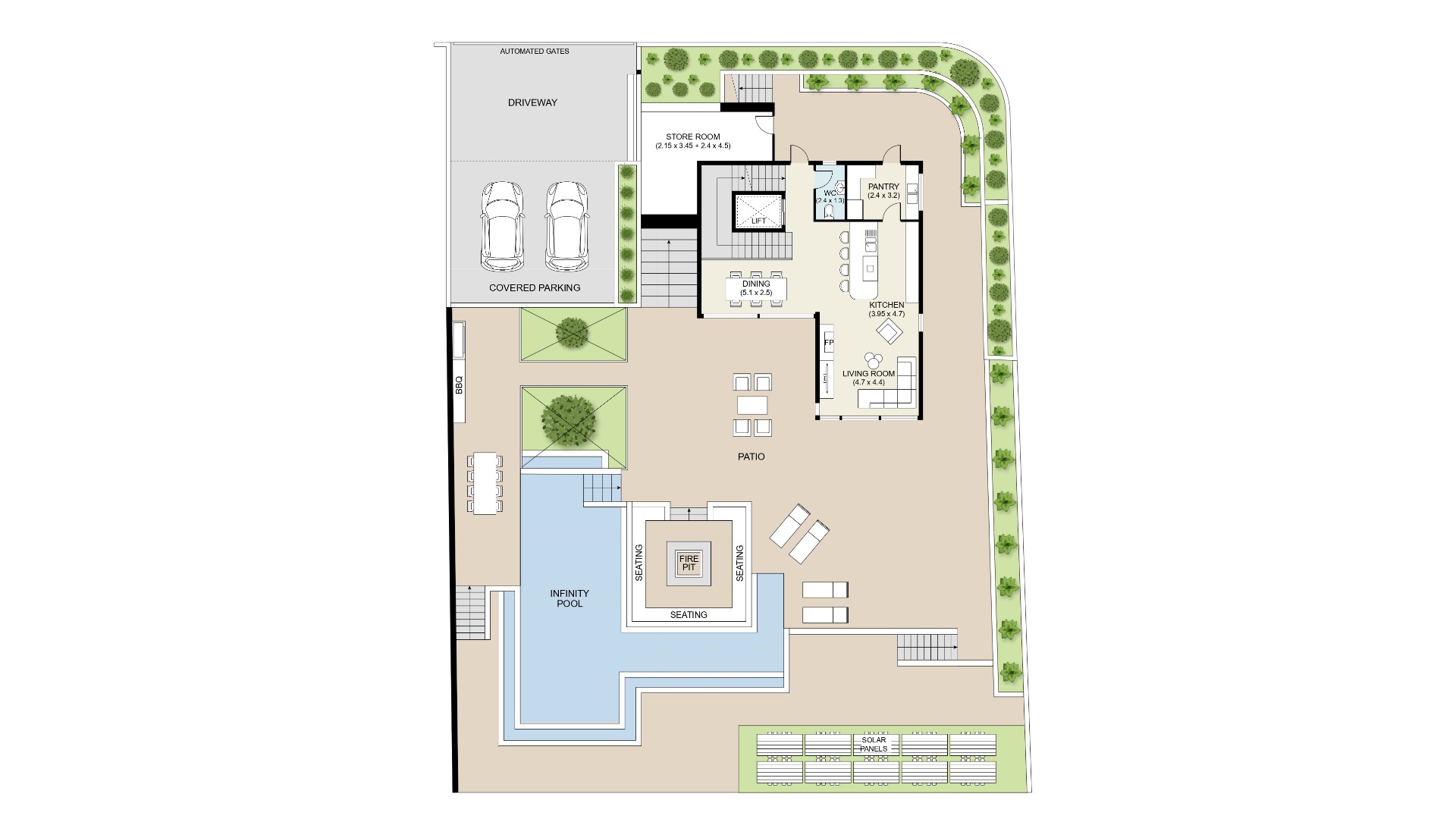 Download PlansVilla 1, situated on the lower tier of the development, is accessible through an automated gate entrance leading to a private driveway capable of accommodating two vehicles. A covered parking area is also provided for two additional vehicles.