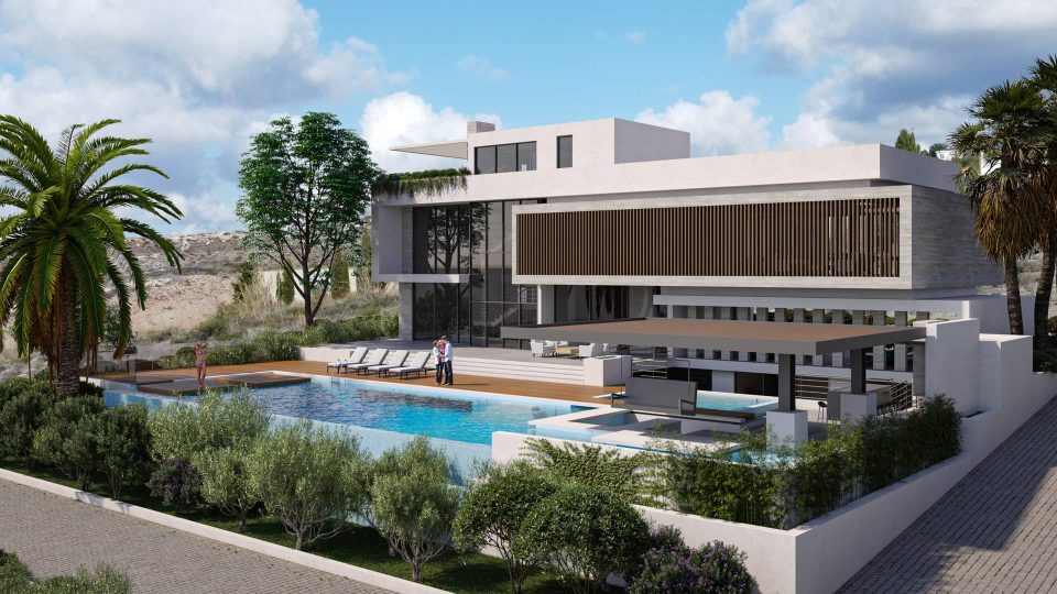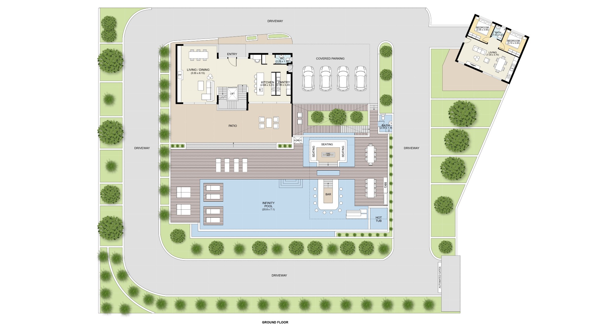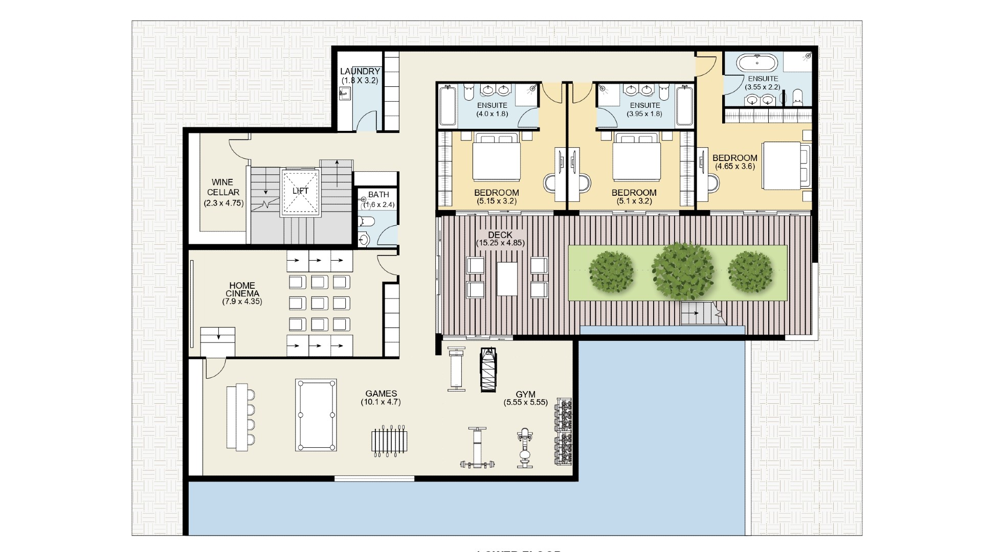 The lower level boasts a sophisticated Home Cinema, a Gym, a Wine Cellar, and a Games room with a spectacular feature glass window looking into the Infinity pool.